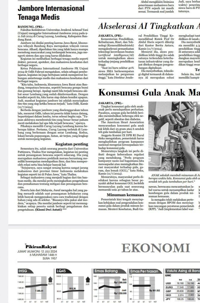 PRFMNEWS – Fakultas Kedokteran Universitas Jenderal Achmad Yani (FK Unjani) menyelenggarakan International Jamboree 2024 pada Selasa 9 Juli 2024 hingga Kamis 11 Juli 2024 di Curug Layung Lembang. Kabupaten Bandung Barat. International Jamboree 2024 yang digelar FK Unjani melibatkan berbagai tenaga medis seperti dokter, perawat, apoteker, dan mahasiswa kesehatan dari berbagai negara. International Jamboree FK Unjani 2024 diketuai oleh dr. Odih Fahruzi, Sp.An-TI, AIFO-K.dibuka secara resmi oleh Prof. Hikmahanto Juwana, SH., LL.M., Ph.D., selaku Rektor Unjani, dan Dr. Wendra, dr., M.Kes., selaku Dekan FK Unjani. Selama tiga hari, para peserta mengikuti berbagai kegiatan yang mencakup workshop, kompetisi, kursus online, dan malam budaya, serta program rekreasi.